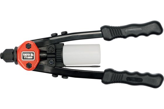 Двуручный заклепочник 3,2 - 6,4мм YATO YT-3609 поставляется с пятью насадками различного диаметра. Конструкция оснащается удобными рельефными накладками на рукоятках и емкостью для остатков от заклепок. Рычажная система имеет высокую эффективность.