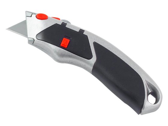 Обрезиненный корпус из цинкового сплава, с контейнером для хранения запасных лезвий внутри.
