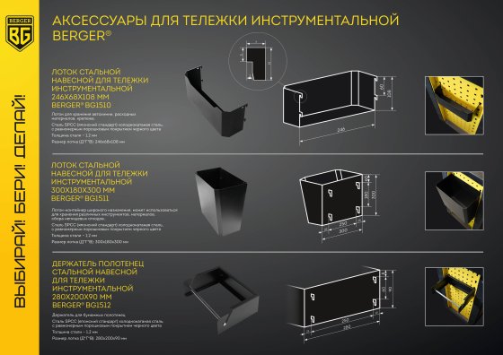 Лоток стальной навесной для тележки инструментальной (246х68х108 мм) BERGER BG1510
