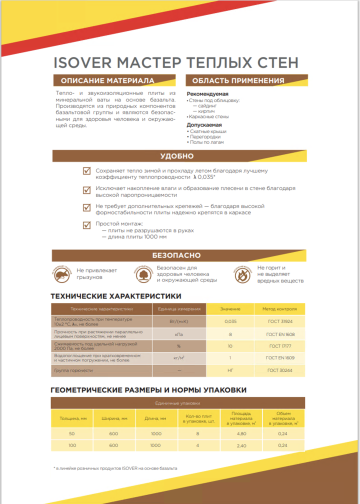 ИЗОВЕР МАСТЕР ТЕПЛЫХ СТЕН 1000х600х100 мм, 0,240 упак(4 плит) 2.4 м2/упак