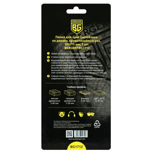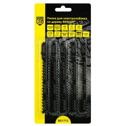 Пилка для электролобзика по дереву T244D, криволинейный рез (5 шт, шаг 4.0 мм, длина 100/75 мм) BERG
