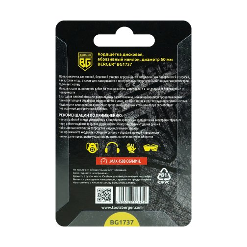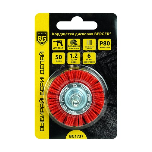 Кордщётка дисковая (абразивный нейлон 1.2 мм, P80, диаметр 50 мм, хвостовик 6 мм) BERGER BG1737