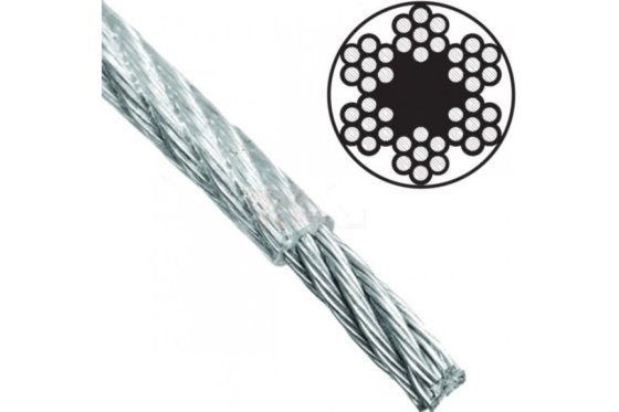 Материал: проволока – сталь, сердечник – растительный или синтетический. Покрытие: белый цинк. DIN 3055. Применение: Применяется в качестве элементов растяжки при установке растяжек, антенн, мачт освещения и т.п. Не применяется для подъема груза. Состоит из высокопрочной проволоки, которая обвивает сердечник, образуя прядь. Которая, в свою очередь, также обвиваются вокруг сердечника, получая трос. Пример обозначения: 6 х 7 + FC. Первая цифра – число прядей троса. Вторая – число проволок в пряди. Третья – число сердечников, включая сердечники в прядях; если нет цифры – неметаллический один в центре троса, а в прядях сердечник стальной. Буквы – материал сердечника: FC – растительный, PVC – синтетический. Если нет буквенного обозначения, это значит, что в качестве центрального сердечника используется такая же прядь, что и в боковых. Используется преимущественно в быту и строительстве