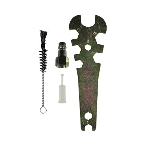Комплектация: краскопульт, бачок, адаптер-соединитель с резьбы F1/4″ на быстросъём M1/4″, пластиковый мини-фильтр для ЛКМ, ключ универсальный для обслуживания краскопульта, щётка для чистки, инструкция по эксплуатации.