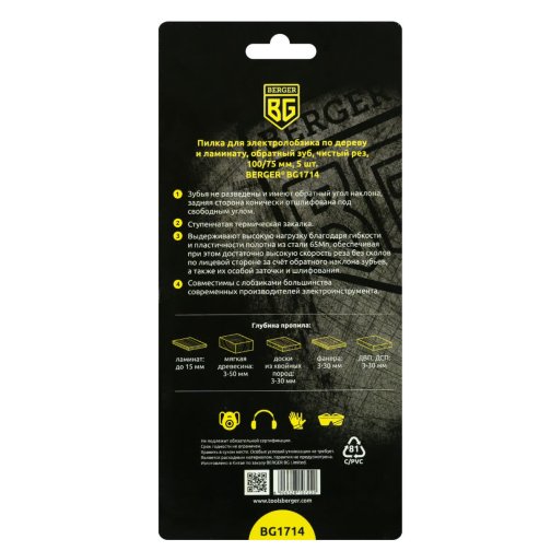 — Выдерживают высокую нагрузку благодаря гибкости и пластичности полотна из стали 65Mn, обеспечивая при этом достаточно высокую скорость реза без сколов по лицевой ст