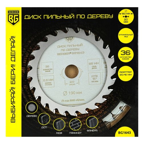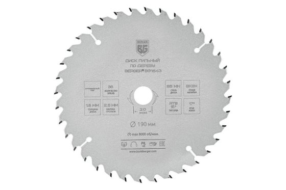 Диск пильный по дереву и ДСП, оптимальный рез (190x20/16x36z, 2.6/1.8 мм, ATB 15°, атака 17°) BERGER