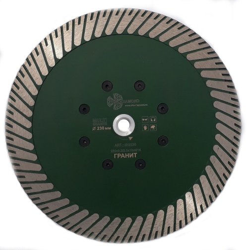 Особенности: Универсальные диски для работы с натуральным камнем. За счет увеличенной площади рабочей поверхности позволяют выполнять широкий спектр работ по резке, шлифовке и снятию фасок. Фланец М-14 позволяет устанавливать данный диск на УШМ без зажимной гайки.