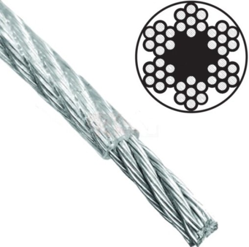 Материал: проволока – сталь, сердечник – растительный или синтетический. Покрытие: белый цинк. DIN 3055. Применение: Применяется в качестве элементов растяжки при установке растяжек, антенн, мачт освещения и т.п. Не применяется для подъема груза. Состоит из высокопрочной проволоки, которая обвивает сердечник, образуя прядь. Которая, в свою очередь, также обвиваются вокруг сердечника, получая трос. Пример обозначения: 6 х 7 + FC. Первая цифра – число прядей троса. Вторая – число проволок в пряди. Третья – число сердечников, включая сердечники в прядях; если нет цифры – неметаллический один в центре троса, а в прядях сердечник стальной. Буквы – материал сердечника: FC – растительный, PVC – синтетический. Если нет буквенного обозначения, это значит, что в качестве центрального сердечника используется такая же прядь, что и в боковых. Используется преимущественно в быту и строительстве.Данная информация взята с сайта компании «РДС Строй» https://rdstroy.ruСо страницы https://rdstroy.ru/catalog/tros_stalnoy_din