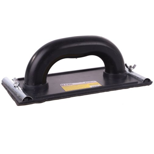Сеткодержатель для шлифования пластиковый имеет специальные металлические фиксаторы для надёжного зажима шлифовальной бумаги и абразивных сеток. Отличительными особенностями данной конструкции являются: 1. Утолщенная ручка, обеспечивающая удобный и надежный хват. 2. Мелкопористая прокладка повышенной износостойкости. Материал, из которого она изготовлена, имеет хорошие упругие характеристики, позволяющие выдерживать большее прилагаемое усилие, а увеличенная толщина позволяет обеспечить равномерное прилегание даже на очень неровных поверхностях. 3. На элементы крепежа нанесено антикоррозионное покрытие, защищающее от ржавчины и позволяющее мыть сеткодержатель после работы. Современные материалы и технологии позволили сделать этот инструмент максимально прочным, легким, дешевым и удобным в работе. Данная конструкция представлена двумя типоразмерами, соответствующими наиболее популярным размерам применяемых абразивных материалов