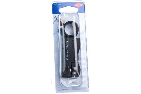 Инструмент для снятия изоляции с коаксиальных кабелей KNIPEX KN-166005SB предназначен для работы с кабелями типа RG 58, RG 59, RG 62. Он удаляет наружную оболочку, экран и изоляцию в один рабочий ход. Имеются три встроенных ножа,глубина каждого из которых настраивается отдельно угловым шестигранным ключом. Положение режущего лезвия не меняется. Корпус выполнен из противоударного пластика.