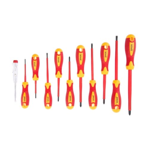 ОписаниеНабор отверток диэлектрических 11 предметов BERGER. 4 шт. – отвертка шлицевая диэлектрическая до 1000V: SL2.5 x 75мм; SL3.5x 100мм; SL5.5 x 125мм; SL6,5 x 150мм; 6 шт. – отвертка крестовая диэлектрическая до 1000V: PH0x 60мм; PH1 x 80мм; PH2 x 100мм; PH3 x 150мм; PZ1x80мм; PZ2x100мм; 1 шт. – отвертка-индикатор до 1000V. Материал: CR-V6150. Твердость материала 51-54 HRC. Упаковка - цветная коробка. Инструмент выполнен из токонепроводящих материалов, что позволяет использовать его для работ с высоким напряжением до 1000V. Соответствует IEC 60900.