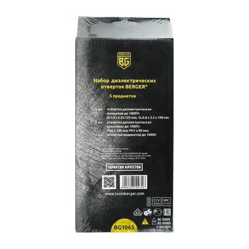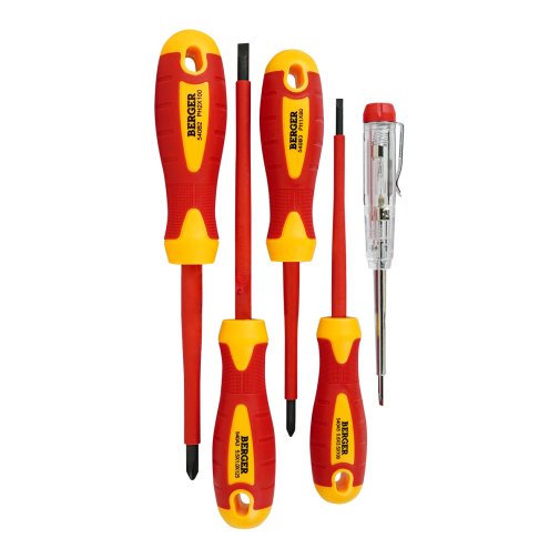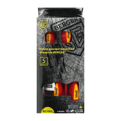 Набор отверток диэлектрических 5 предметов BERGER. 2 шт. – отвертка диэлектрическая шлицевая до 1000V: SL5.5x 125мм; SL3.5 x 100мм; 2 шт. – отвертка диэлектрическая крестовая до 1000V: PH2 x 100мм; PH1 x 80мм; 1 шт. – отвертка-индикатор до 1000V. Материал: CR-V 6150. Твердость материала 51-54 HRC. Упаковка - цветная коробка. Инструмент выполнен из токонепроводящих материалов, что позволяет использовать его для работ с высоким напряжением до 1000V. Соответствует IEC 60900.