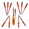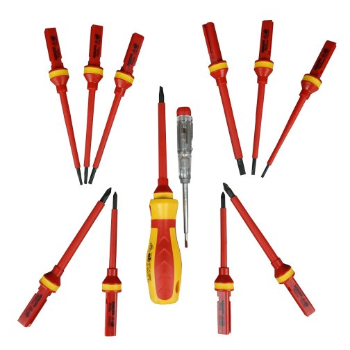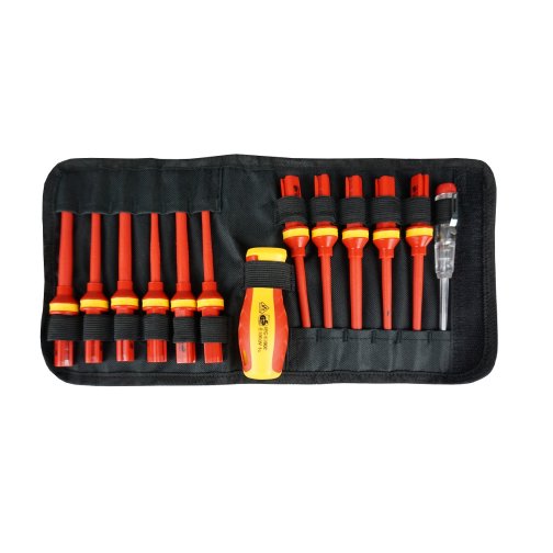 2 шт. – сменная насадка крестовая диэлектрическая до 1000V: PH2x100мм, PH1x80мм; 2 шт. – сменная насадка Pozidirv диэлектрическая до 1000V: PZ2x100мм, PZ1x80мм; 3шт. – отвертка Torx:T20x100мм,T15x100мм,T10x100мм; 1 шт. – отвертка индикатор до 1000V; 1шт. – ручка диэлектрическая до 1000V. Материал: CR-V6150. Твердость материала 51-54 HRC. Упаковка: матерчатый чехол + цветная коробка. Инструмент выполнен из токонепроводящих материалов, что позволяет использовать его для работ с высоким напряжением до 1000V. Соответствует IEC 60900. В состав набора входит отвёртка-индикатор со встроенной неоновой лампой внутри, на одном конце которой жало, на другом — шунтовой контакт.