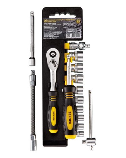 Набор инструментов 1/4" 15 предметов BERGER. 9шт.-головка торцевая 6-гранная Super lock 1/4": 6,7,8,9,10,11,12,13,14мм; 1шт.-удлинитель 1/4": 100мм; 1шт.-гибкий удлинитель 1/4": 150мм; 1шт.-удлинитель со скользящим переходником 1/4": 110мм; 1шт.-кардан шарнирный 1/4":38мм; 1шт.-трещотка 1/4": 45 зубов; 1шт.-отвертка с присоединительным квадратом. Выполнен из прочной и качественной хром-ванадиевой стали (CR-V). Упаковка - пластиковый держатель.