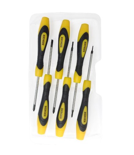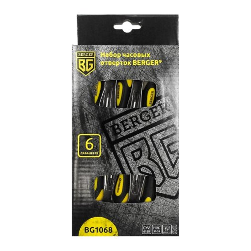 Набор отверток часовых 6 предметов BERGER. 3 шт. – отвертка шлицевая: SL1 x 50мм; SL2 x 50мм; SL3 x 50мм; 3 шт. – отвертка крестовая: PH000 x 50мм; PH0x 50мм; PH1 x 50мм. Материал: CR-V 6150. Упаковка - цветная коробка. Твердость материала 51-54 HRC.