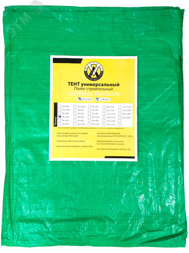 обеспечивает надежную защиту любых объектов от негативного воздействия. Материал УФ стабилизирован. Применение:для создания тентов и навесов; для укрытия стройматериалов от дождя и снега;для закрытия оконных проемов, строительных лесов, недостроенной кровли; для укрытия грузов, прицепов, автомашин, катеров; для укрытия сельскохозяйственной продукции (зерно, сено).