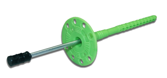 Фасадный полимерный тарельчатый дюбель диаметром 10 мм, длиной 350 мм, диаметром тарельчатого элемента 60 мм, со стальным гвоздем с термоизоляционной головкой длиной 22 мм, для крепления теплоизоляционных материалов толщиной 30-270 мм к внутренним и наружным стенам в мало- и многоэтажном строительстве. Назначение Для крепления теплоизоляционных строительных материалов и изделий (толщиной до 270 мм) к наружным и внутренним поверхностям ограждающих конструкций зданий и сооружений из: бетона, кладки из полнотелого и пустотелого керамического кирпича, керамзитобетонных блоков, ячеистого бетона, силикатного кирпича.