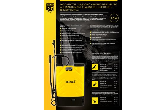 Распылитель садовый универсальный 2-в-1 BERGERⓇ «АЙСТОБЕЛЬ» предназначен для распыления воды, водных растворов ядохимикатов, моющих средств и консервантов при химической защите растений от вредителей и болезней, борьбе с сорной растительностью и противоэпидемической обработке скота. Также может использоваться для дезинфекции, дезинсекции, мытья зданий и машин.