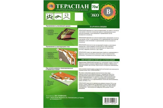 Пароизоляционный материал ТЕРАСПАН В ЭКО 70 кв. м 4660077150167 применяется в качестве пароизоляции, для защиты утеплителя и внутренних элементов конструкции кровли от проникновения влаги изнутри помещения, а само помещение от проникновения частиц волокнистого утеплителя.