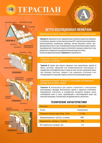 Тераспан А Стандарт используется для защиты утеплителя в конструкциях вентилируемых фасадов многоэтажных зданий с наружным утеплением. Предохраняет утеплитель от воздействия холодного воздуха, ветра, атмосферной влаги и снега, проникающих в вентилируемый зазор под внешнюю облицовку. Способствует испарению влаги из утеплителя.